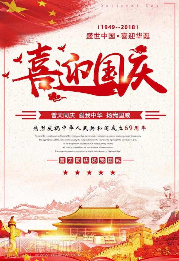 秋高氣爽國慶節(jié),舉國歡慶吉祥到,張燈結彩焰火舞,人潮如涌街巷滿,紅旗獵獵隨分飄,國泰民安幸福來。德愷機械全體員工祝大家國慶節(jié)快樂!